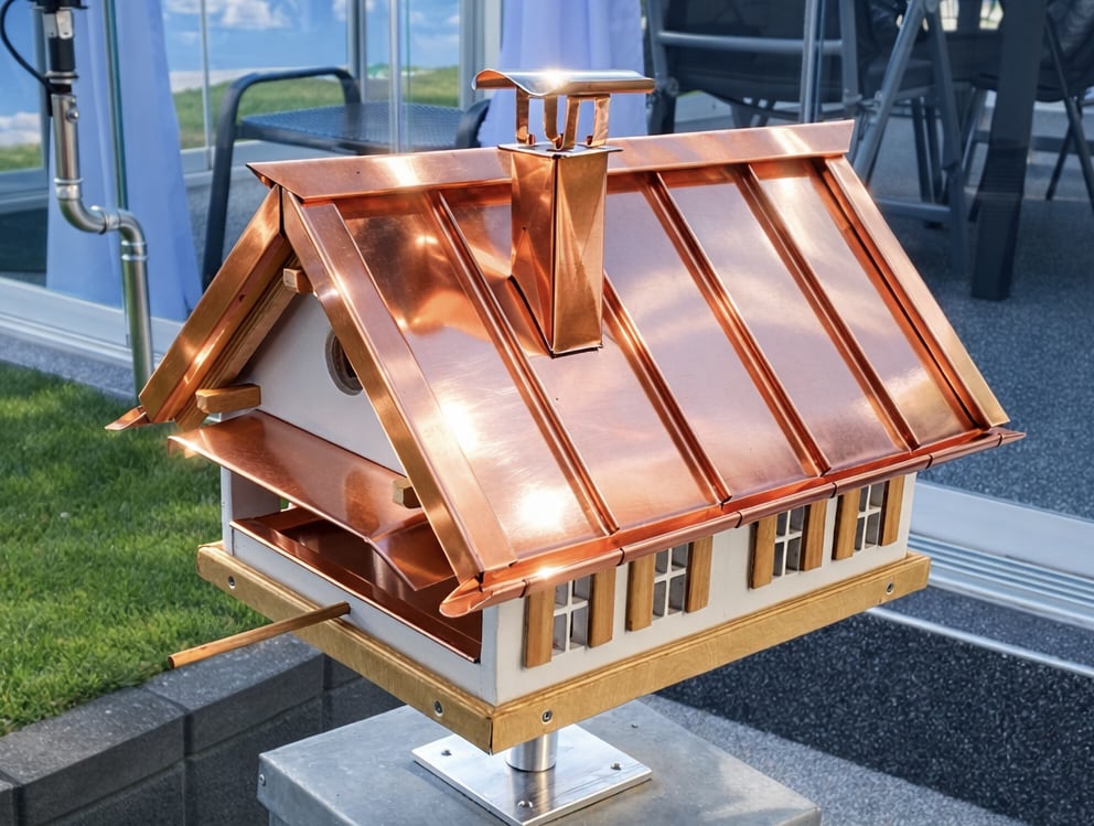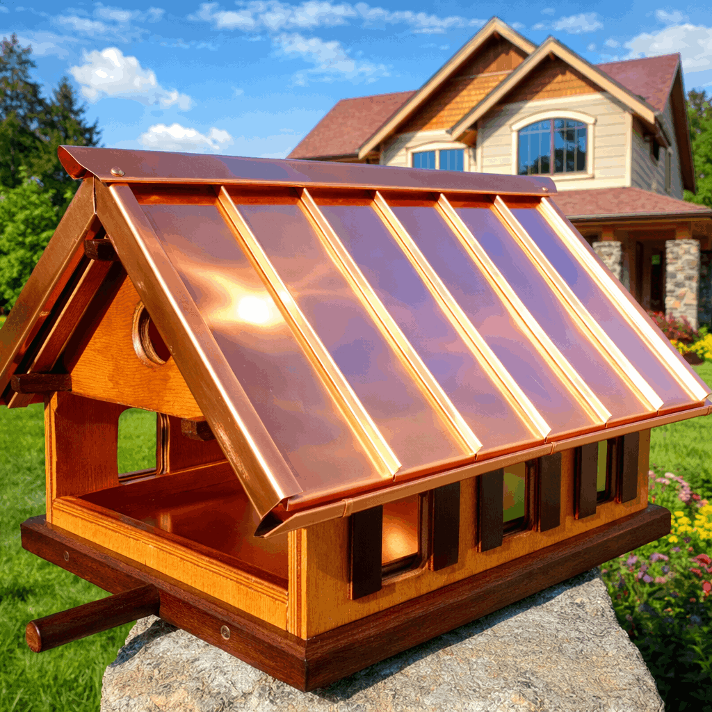 Dieses Vogelhaus ist in vier verschiedenen Größen ab 120.- € erhältlich. Alle Größen und Preise entnehmen sie unserer Tabelle am Ende der Seite. Dieses Vogelhaus besteht aus 5 Schaaren pro Seite und Dachrinne mit Rinnenträger. Alle unsere Vogelhäuser werden aus hochwertigem Birkenschichtholz gefertigt. Das Dach kann wahlweise aus Kupfer, Titanzink oder eloxiertem Aluminiumblech gefertigt werden. Zum Schutz des Holzes werden die Vogelhäuser zweifach mit einer Holzlasur behandelt.